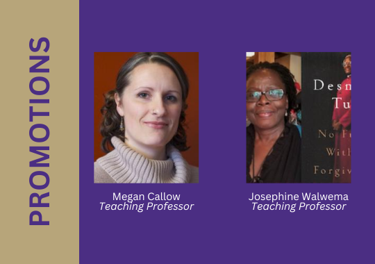 The English Department would like to extend special congratulations to Megan Callow and Josephine Walwema for their promotions to the rank of Full Teaching Professor earlier this year.